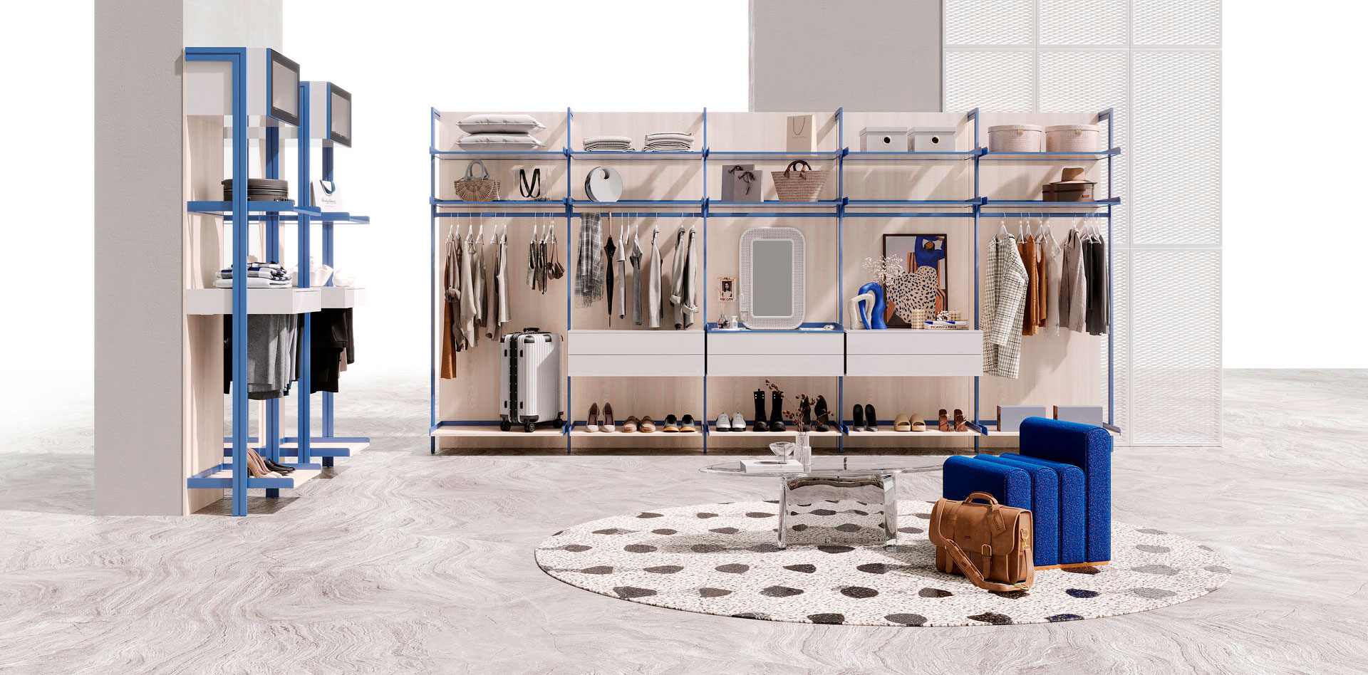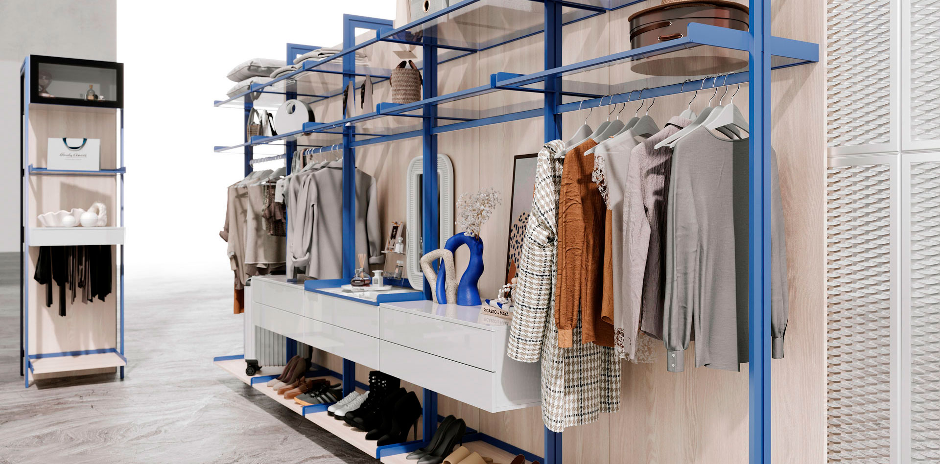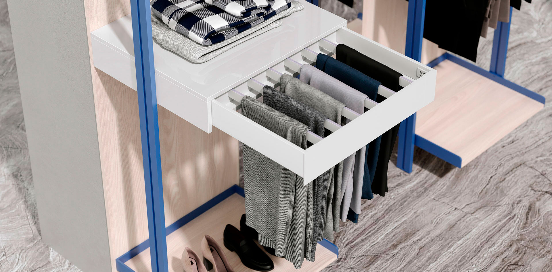 Гардеробная Розария — не просто место для хранения, а настоящий оазис стиля, где каждая вещь находит свое место. Каждая деталь продумана до мелочей: удобные полки и ящики обеспечивают идеальную организацию, позволяя легко находить любимые вещи.