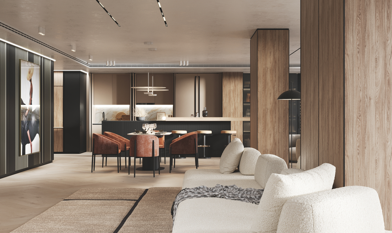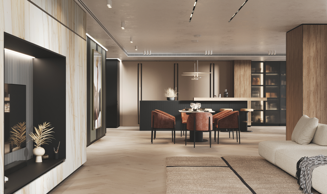 Этот 3D тур откроет для вас просторные апартаменты, где царит атмосфера уюта и сбалансированной гармонии. Интерьер построен на теплой, нейтральной палитре, создающей чувство спокойствия и надежности. Элегантные акценты, подобные вспышкам осеннего солнца, добавляют интерьеру энергии и игривости. Проект демонстрирует продуманное зонирование: здесь найдется место как для тихого отдыха, так и для жизни полной событий. Отдельное пространство, наполненное светом, отведено для детской, где царит своя особая, вдохновляющая атмосфера. Каждая деталь, включая мебель и отделку, была изготовлена на собственном производстве для идеального соответствия замыслу. Это гарантирует единство стиля и безупречное качество во всех комнатах. Этот тур — возможность увидеть, как создается современное семейное гнездышко, где каждый сантиметр продуман для комфорта. Погрузитесь в интерьер, который говорит на языке тепла и заботы.